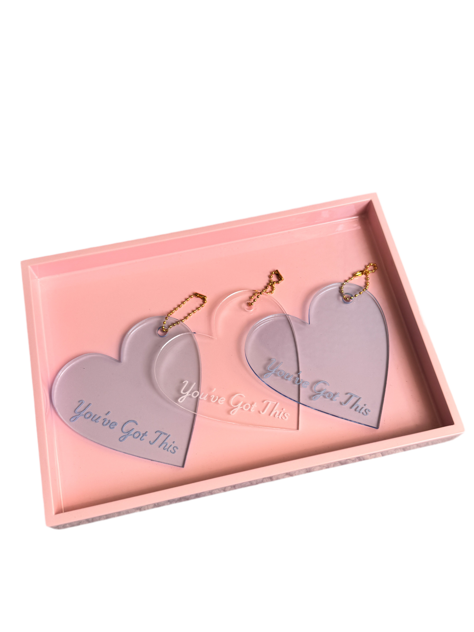 A little reminder that goes wherever you do! This clear acrylic heart charm with etched lettering is the perfect way to carry inspiration on the go. Clip it to your tote, backpack, keys, or luggage and let it remind you (or someone you love) that you’ve got this.